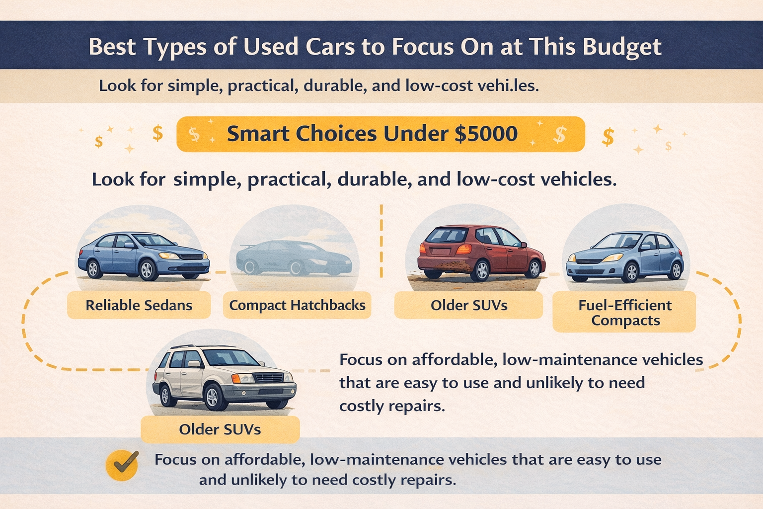 When your budget is under $5000, the safest strategy is usually to focus on simple, practical vehicles. This is not the price range where most buyers should chase luxury, performance, or complicated drivetrains. The goal is to find something affordable to own, reasonably reliable, and easy to maintain.