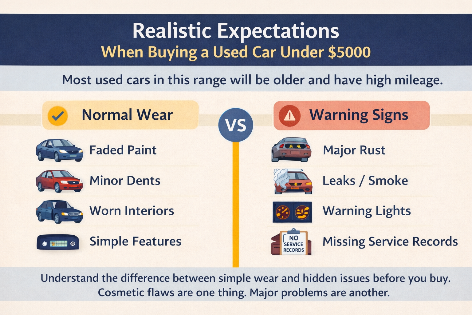 What matters is knowing the difference between normal wear and real warning signs. Cosmetic flaws are one thing. Major rust, leaks, warning lights, rough shifting, overheating, or missing service history are something else.