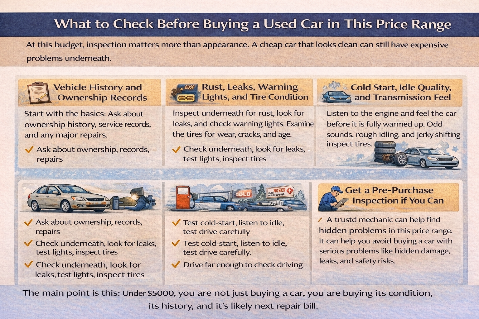 The main point is simple: under $5000, you are not just buying a car. You are buying its condition, its history, and its likely next repair bill.