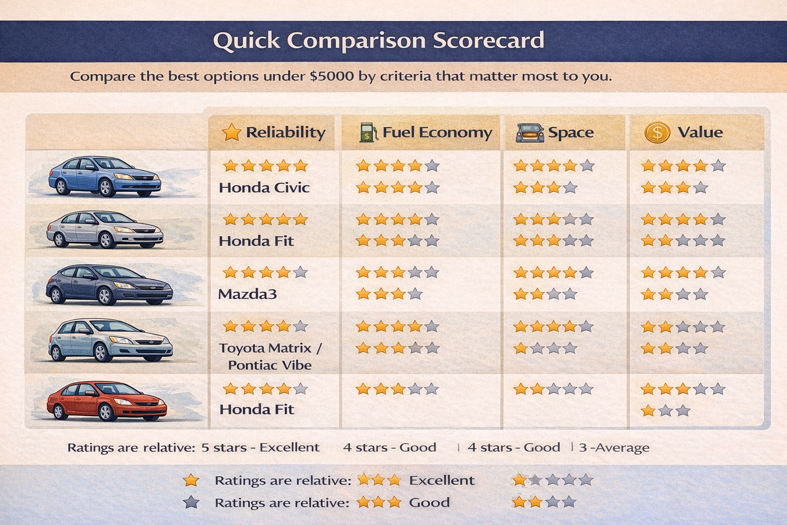At this budget, no model is automatically a good buy just because of its reputation. Condition still comes first. But some used cars tend to make more sense than others because they are practical, easier to live with, and more realistic to maintain.