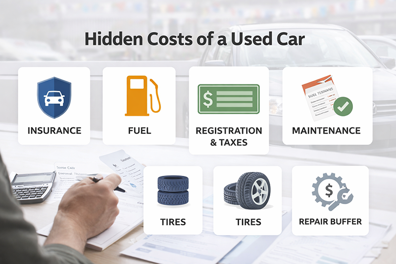 That means deciding what you can afford to spend on the vehicle itself, while also leaving room for the costs that come with ownership. A used car purchase is rarely just the listed price. There may also be tax, insurance, registration, fuel, routine maintenance, tires, and unexpected repairs shortly after purchase.